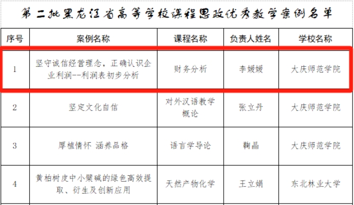 近日,在黑龙江省教育厅组织的第二批高校课程思政优秀教学案例遴选工作中,经组织推荐、专家遴选、会议评选和网络公示等程序,英国上市公司365李媛媛老师主讲的《财务分析》课程教学案例“坚守诚信经营理念,正确认识企业利润--利润表初步分析”获第二批黑龙江省高等公司课程思政优秀案例。希望全院教师以此为契机,持续推动课程思政教学改革,切实发挥教师队伍“主力军”、课程建设“主战场”、课堂教学“主渠道”作用,深入发掘和提炼各类课程所蕴含的思政要素和德育功能,强化课程育人导向。