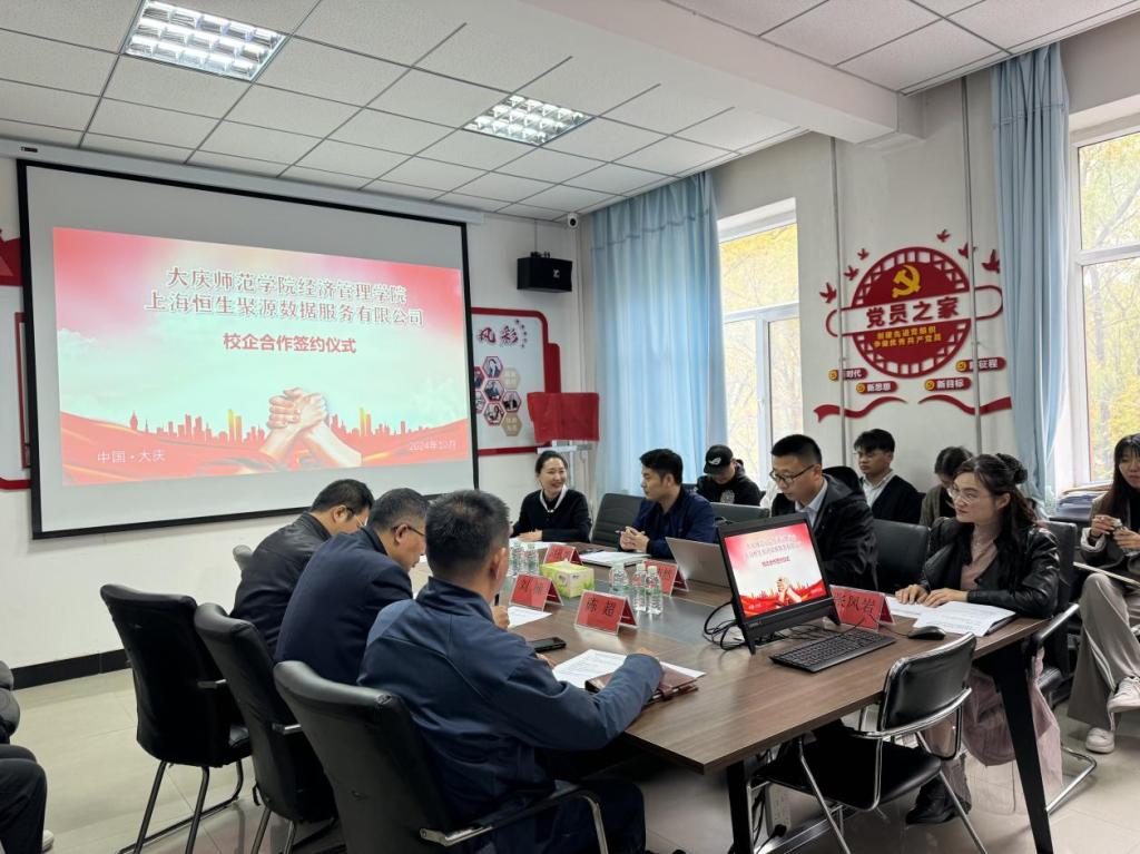 2024年10月16日15点,英国上市公司365与上海恒生聚源数据服务有限公司的校企合作签约仪式在五教203会议室举行,会议由英国上市公司365经济与金融系系主任王植荔副教授主持。