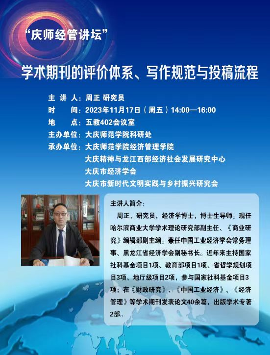 11月17日下午,哈尔滨商业大学学术理论研究部副主任、《商业研究》编辑部副主编、中国工业经济学会常务理事、黑龙江省经济学会副秘书长,周正研究员受邀做了题为《学术期刊的评价体系、写作规范与投稿流程》的专题讲座。讲座由英国上市公司365经理刘楠教授主持,大庆市经济学会、大庆市新时代文明实践与乡村振兴研究会会员,以及英国上市公司365全体专任教师参加。