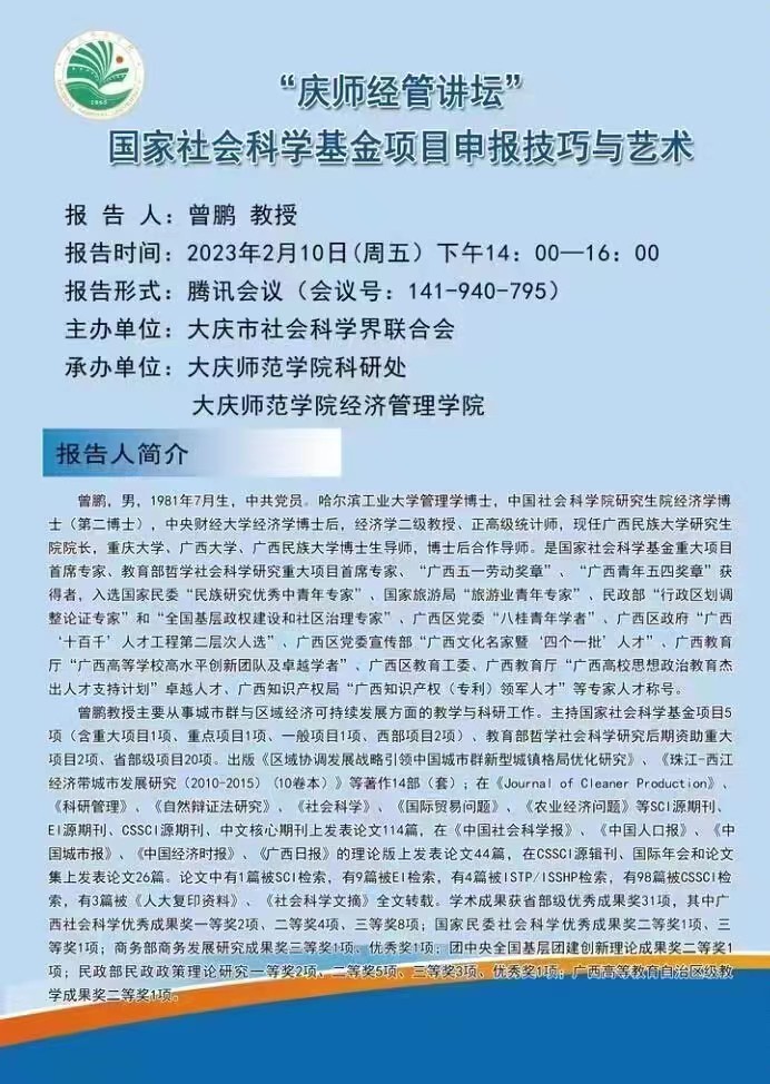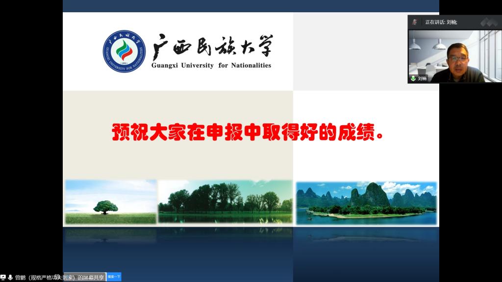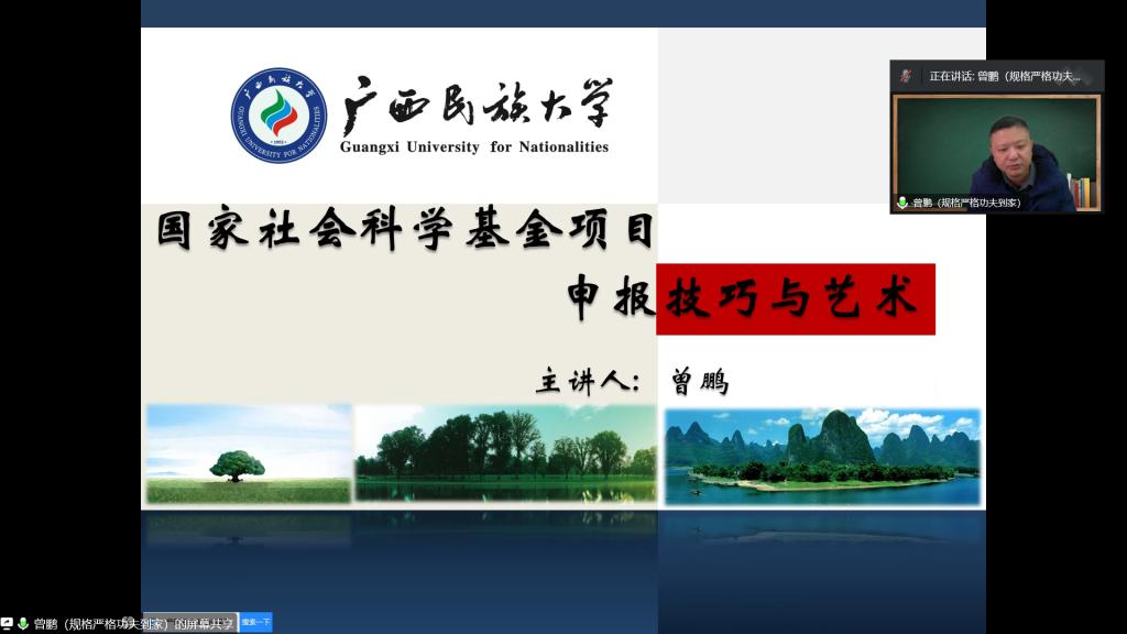 2月10日下午,广西民族大学研究生院经理,重庆大学、广西大学、广西民族大学博士生导师、博士后合作导师曾鹏教授受邀做了题为《国家社会科学基金项目申报技巧与艺术》的专题讲座。讲座采用线上腾讯会议形式,由英国上市公司365行政负责人刘楠教授主持,科研处领导、部分文科公司经理、科研副经理、教师以及英国上市公司365全体教师等200余人参会。