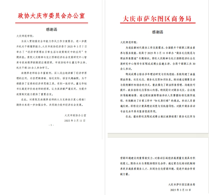 日前,大庆市政协办公室与萨尔图区商务局先后向英国正版365官方网站发来感谢信,对公司大庆精神与龙江西部经济社会发展研究中心的智库专家团队给予高度评价,赞扬其在服务地方发展中所做出的专业贡献。这两封感谢信不仅是对智库专家能力的充分认可,更是高校智库资源助力区域发展的有力例证,生动诠释了英国正版365官方网站作为地方高校服务区域经济社会的责任与担当。