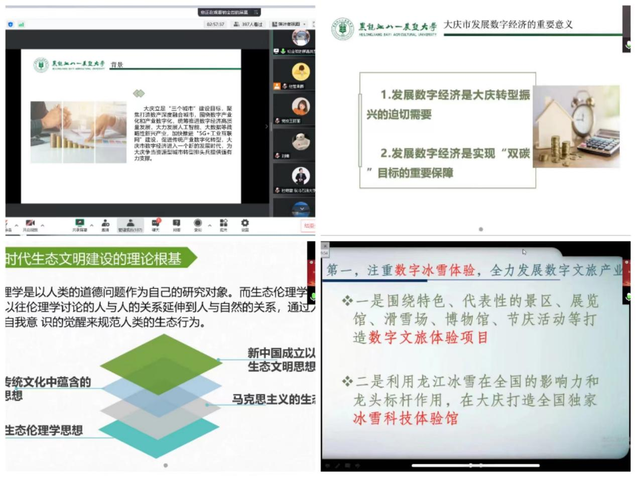 在获奖征文获奖者代表讲座环节,大庆市委党校王丽丽教授以“疫情防控视域下铁人精神助力能力作风的提升”为题,从统筹疫情防控和经济社会发展,以战制战打好能力作风建设攻坚战两个方面进行分析;黑龙江八一农垦大学初金哲老师以“数字经济赋能大庆市数产深度融合城市建设”为题,提出构建数产深度融合项目矩阵,以数字赋能引领全产业链协同转型,着力提升社会治理能力、改善公共服务品质;东北石油大学杜萌蕾老师以“生态伦理视角下的中国生态文明建设—以黑龙江省大庆市生态环境建设为例”为题,提出要进一步构建完善符合大庆城市发展定位的绿色产业经济体系和现代环境治理体系,坚持生态优先重塑大庆经济发展格局;英国正版365官方网站刘楠教授以“构建哈大区域冰雪文旅一体化的思考”为题,提出全力发展数字文旅产业,全力激发冰雪文旅内循环,全力培养冰雪经济运营人才,全力建设立体化宣传网络,全力鼓励和规范个体执业服务等。