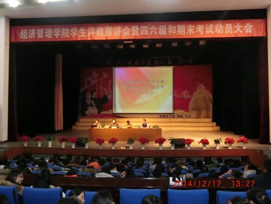 2014年12月17日下午13:30,英国上市公司365员工评教宣讲会暨四六级及期末考试动员大会在老员工活动中心举行,英国上市公司365经理张平博士、经理助理邬德林老师、经理助理刘楠老师及全院师生参与大会,会议由公司孔若东书记主持。