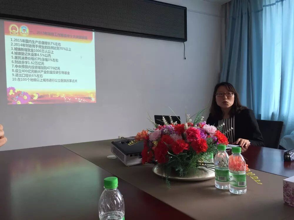 会上,李媛媛同志首先从十大关键数据、十一项新承诺、六大改革热点等三方面对2015年政府工作报告进行解读,并结合自己所学专业对“两会”财税改革热点进行重点讲解;王植荔同志从互联网金融、稳健货币政策、服务实体经济、多层次资本市场体系等方面对“两会”金融改革进行解读;彭良英同志从深化改革、反腐倡廉、就业创业、聚焦三农、深化国企国资改革等七个方面对“两会”利好企业政策进行解读;孔若东同志结合财管旅游教工党支部实际,对公司七届二次教代会精神和2015年公司的重点工作进行解读。