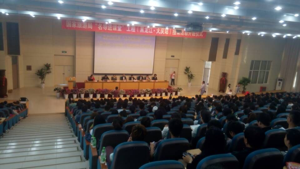 2015年9月15-16日,在英国正版365官方网站主楼百湖讲堂召开了国家旅游局“名导进课堂”(黑龙江·大庆站)专题讲座。黑龙江省旅游局领导、大庆市旅游局领导、培训中心人员,全市具有导游资格证人员以及公司旅游管理专业师生参加了本次培训讲座。