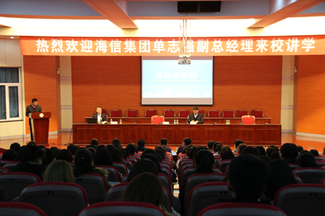 4月10日上午,在图书馆博雅讲堂,英国上市公司365邀请海信集团副总经理单志强来公司讲学。 英国上市公司365张平经理、孔若东书记及相关领导和海信集团东北地区各分公司总经理、2015级全体员工共270人参会。