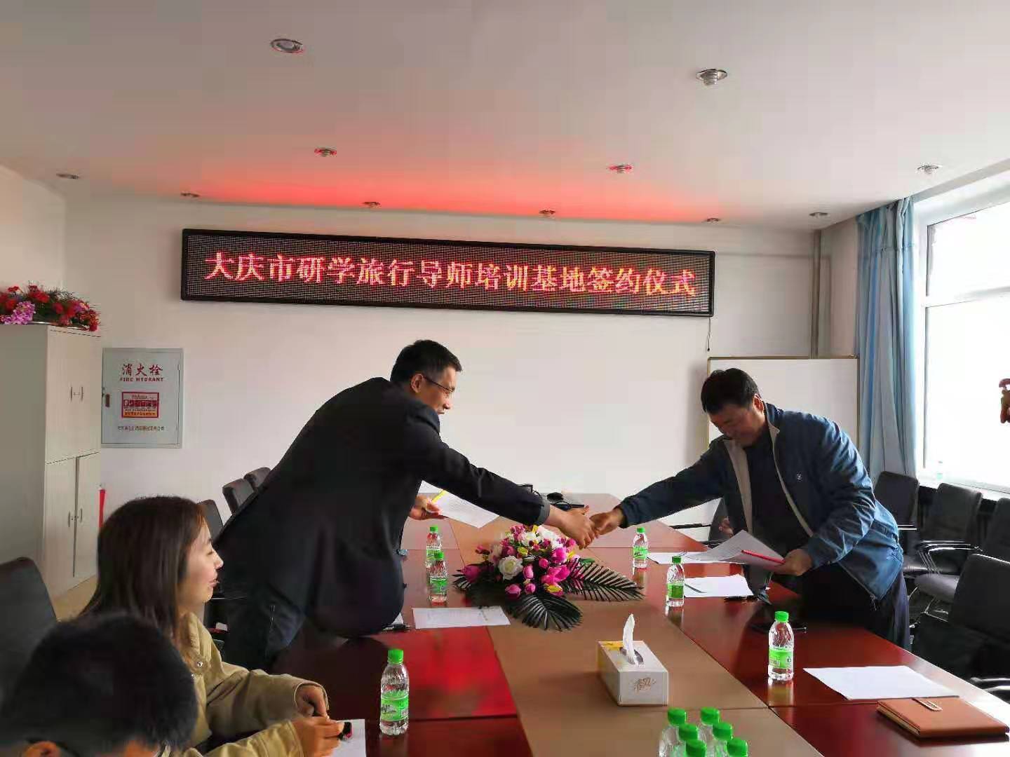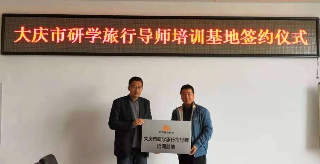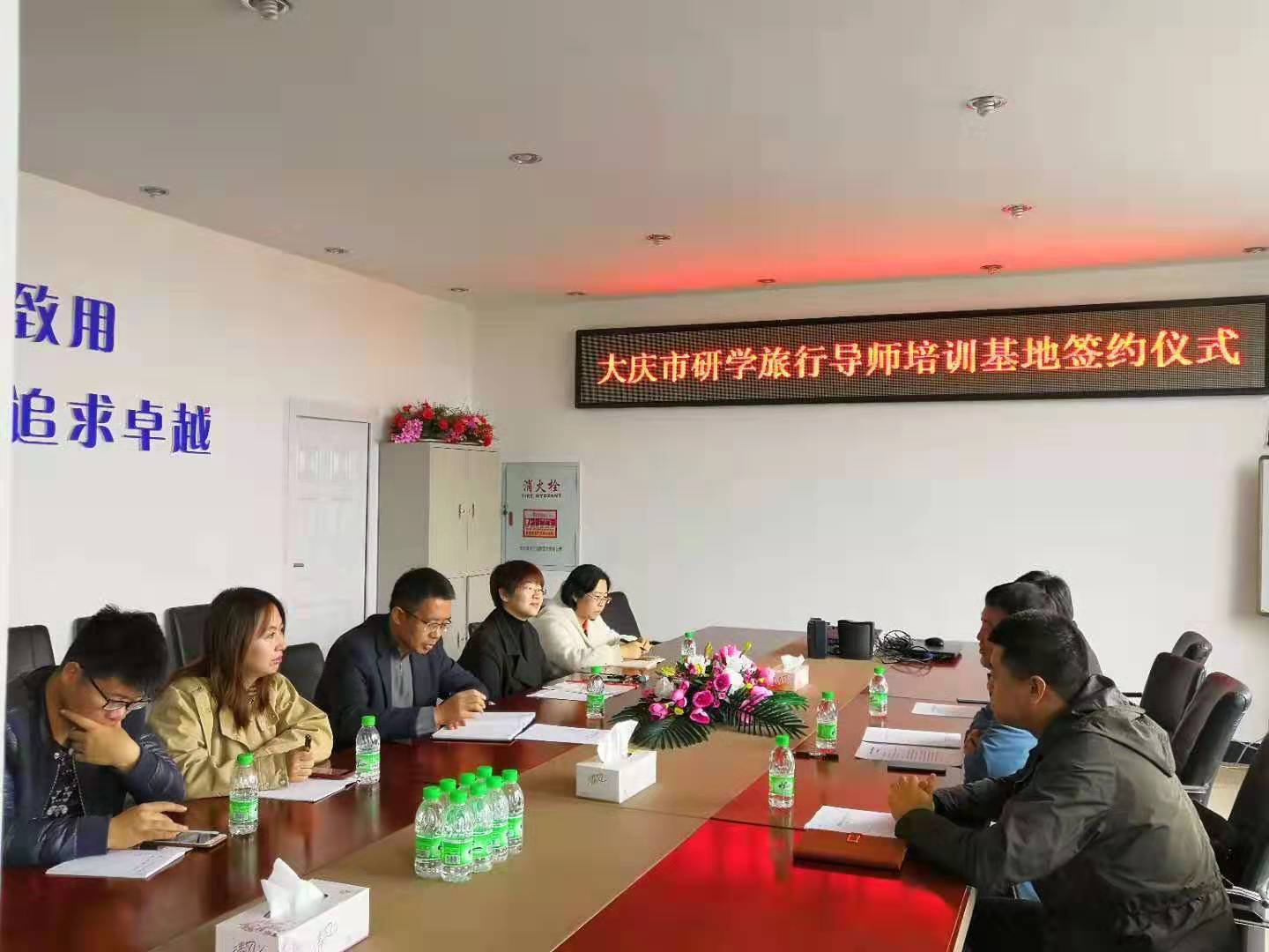 2019年10月28日上午9点,“大庆市串联行知研学指导教师培训基地”签约授牌仪式在公司会议室举行,刘楠经理、行知研学教育公司郭总、研学导师张孟楠、大庆广电旅行社初总参加签约仪式。仪式由旅游管理系主任车鑫主持,旅游管理系骨干教师参与讨论。