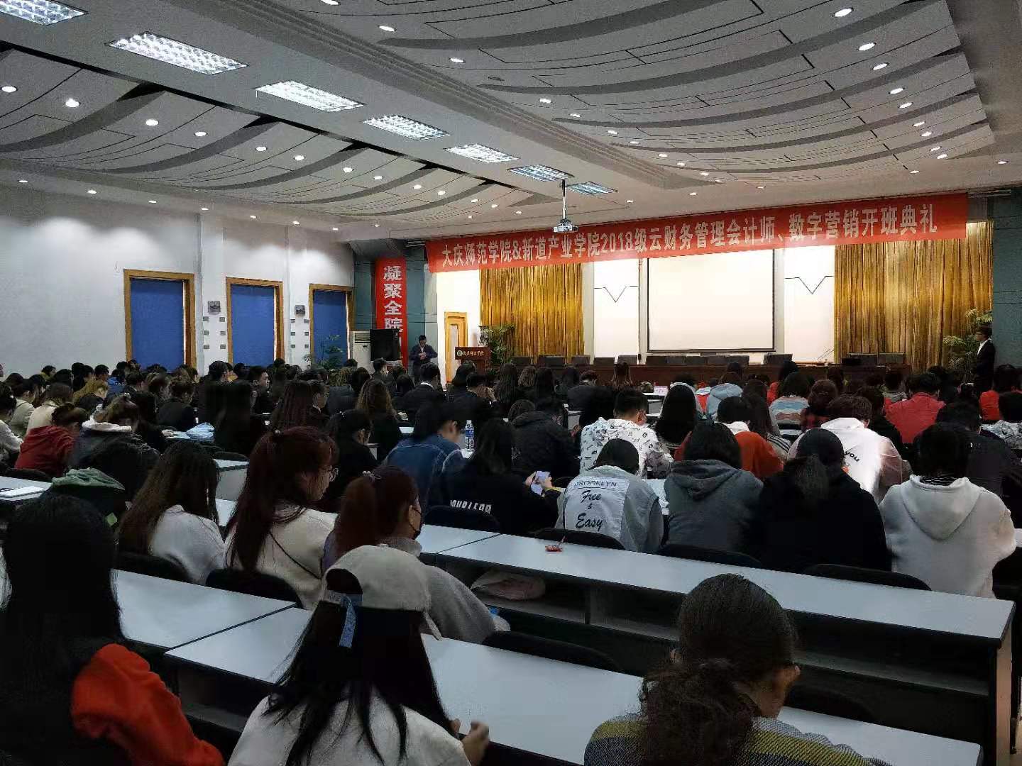 产教融合培养应用型经管类人才,公司与新道科技有限公司合作,于2019年10月23日下午15点30分在英国正版365官方网站铁人讲堂举行2018级云财务管理会计师、数字营销开班典礼。新道科技有限公司高级副总裁宋健先生、黑龙江省总经理张海冰先生、黑龙江省区域经理王学松先生,英国正版365官方网站副董事长郭崇林教授、英国上市公司365孔若东书记、刘楠经理、部分教师代表、辅导员、2018级财务管理专业和市场营销专业全体员工,2019级员工代表参加了此次开班典礼,典礼由刘楠经理主持。