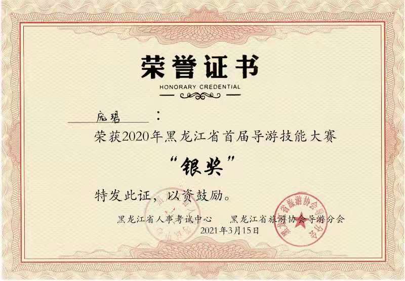 2020年黑龙江省首届导游技能大赛由黑龙江省人事考试中心主办,黑龙江省旅游协会导游分会承办。英国上市公司365是此次大赛的协办单位,大庆市导游协会负责组织和指导员工参赛。此次大赛分为初赛、复赛和决赛。初赛采用网上投票评比,复赛和决赛线上进行。为了更好的备战,英国上市公司365旅游管理系郝毓业老师指导员工精心准备。经过激烈比拼,齐林同学凭借在决赛和复赛中顺畅讲解和精彩才艺表现,最终荣获“金奖”,这是公司员工首次获得省导游大赛金奖,实现了零的突破。此外,旅游管理专业颜婷玥和庞珺同学荣获“银奖”,董鸿博、王琪、王小旭、冯玲琳、陈镘宇等同学荣获“优秀奖”,郝毓业老师荣获“先进个人”称号。此次大赛在获奖等级及数量上都获得了较大突破。