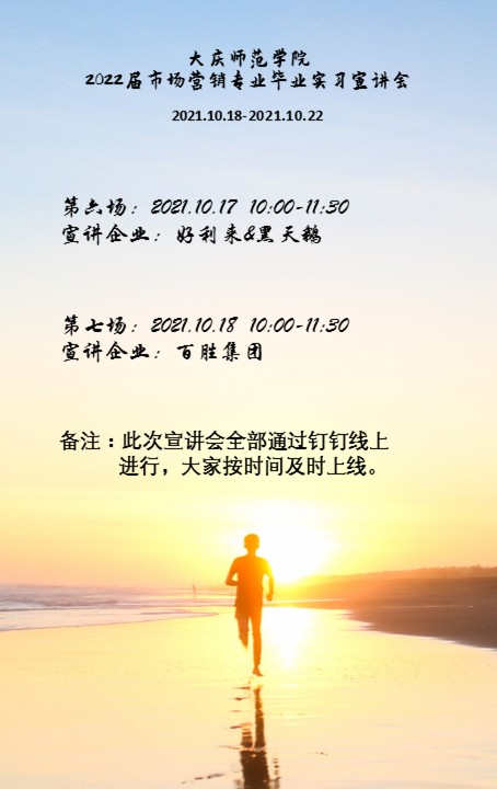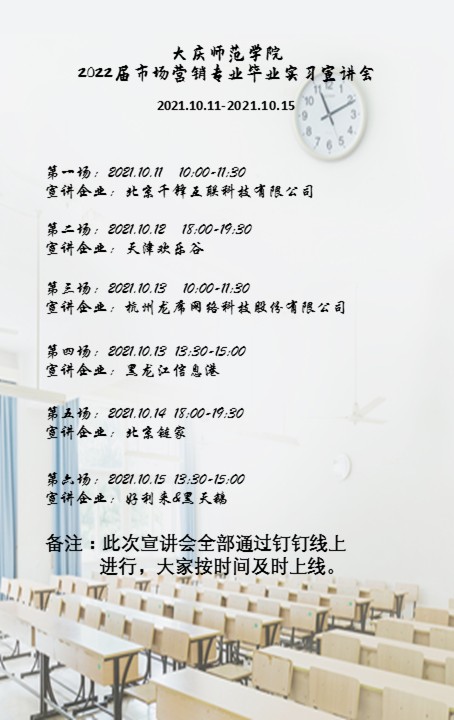 此次实习宣讲从10月11日-10月22日持续开展12天,由于疫情期间,此次宣讲会全部安排线上进行,专门为员工建立了钉钉宣讲群,方便员工与实习企业的实时沟通。在第一场宣讲会之前市场营销系主任尚德萍为员工做了实习动员大会,介绍了本学期的实习目的,时间和要求,便于大家合理安排自己的时间和选择实习企业,下表附宣讲会安排。