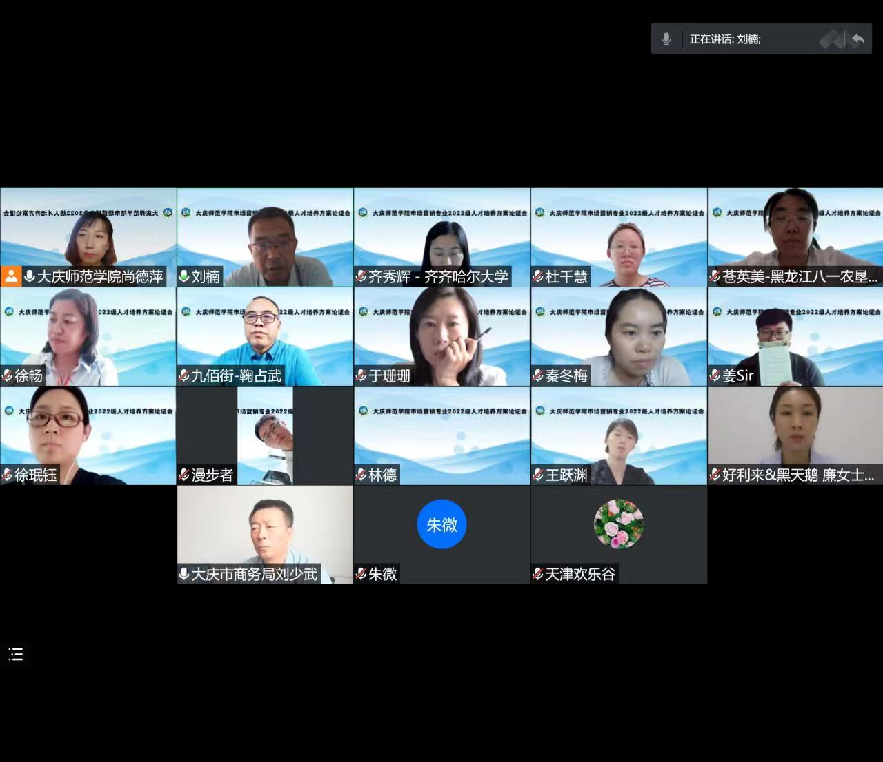 2022年7月15日13:30-15:30,市场营销系召开了2022级人才培养方案论证会,会议采用腾讯会议的方式,邀请了政府、合作企业和高校的专家10位,大庆市商务局电子商务科科长刘少武、齐齐哈尔大学市场营销系主任齐秀辉、东北石油大学营销与旅游系主任徐畅、黑龙江八一农垦大学市场营销系主任苍英美、北京巨量引擎网络技术有限公司巨量部于珊珊、北京市好利来&黑天鹅餐饮管理有限公司招聘部负责人廉美琦、天津欢乐谷人事部经理刘喆、哈尔滨润牛商业有限公司人力资源部主任王雪、大庆九佰街网络科技有限公司董事长鞠占武10专家和英国上市公司365行政负责人刘楠、教学负责人李媛媛、科研负责人孙伟仁以及市场营销系全体教师参加了论证会,会议由市场营销系主任尚德萍主持。