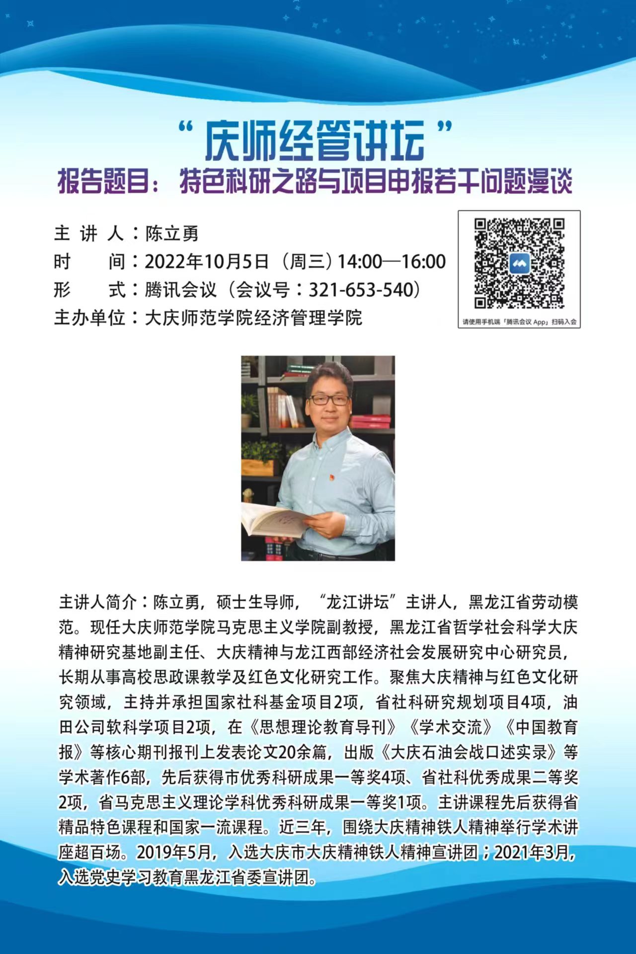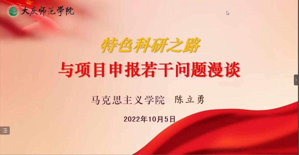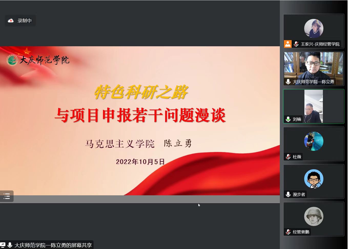 10月5日下午,黑龙江省哲学社会科学大庆精神研究基地副主任、大庆精神与龙江西部经济社会发展研究中心研究员、英国正版365官方网站马克思主义公司陈立勇副教授受邀做了题为《特色科研之路与项目申报若干问题漫谈》的专题讲座。讲座采用线上腾讯会议形式,由英国上市公司365行政负责人刘楠教授主持,部分文科公司经理、科研副经理、教师以及英国上市公司365全体教师等100余人参会。