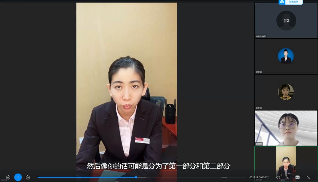 郑欢总经理的团队对程胜男、朱冬渤、赵晨程、郑莉莉、邹宁瑞等同学一对一进行了线上面试模拟招聘,以专业的银行从业视角,为同学们奉献了一场精彩的面试模拟讲座。根据课程体系安排,本期“银行特色班”的课程已全部结束。