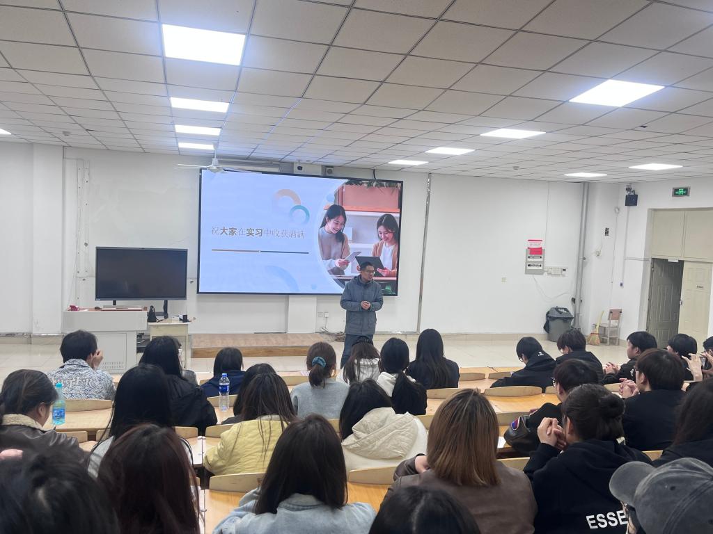 会议中尚德萍老师首先向同学们介绍了实习的总体安排,详细解读了实习课程安排、实习方式、实习企业以及实习要求等关键内容。在实习企业介绍环节,尚老师重点介绍了快消品企业、电商和新媒体企业以及房地产行业等领域的实习机会,政府、事业单位也将开放一定数量的实习岗位,供同学们选择,尚老师鼓励同学们根据自己的兴趣和职业规划,积极选择适合自己的实习企业。